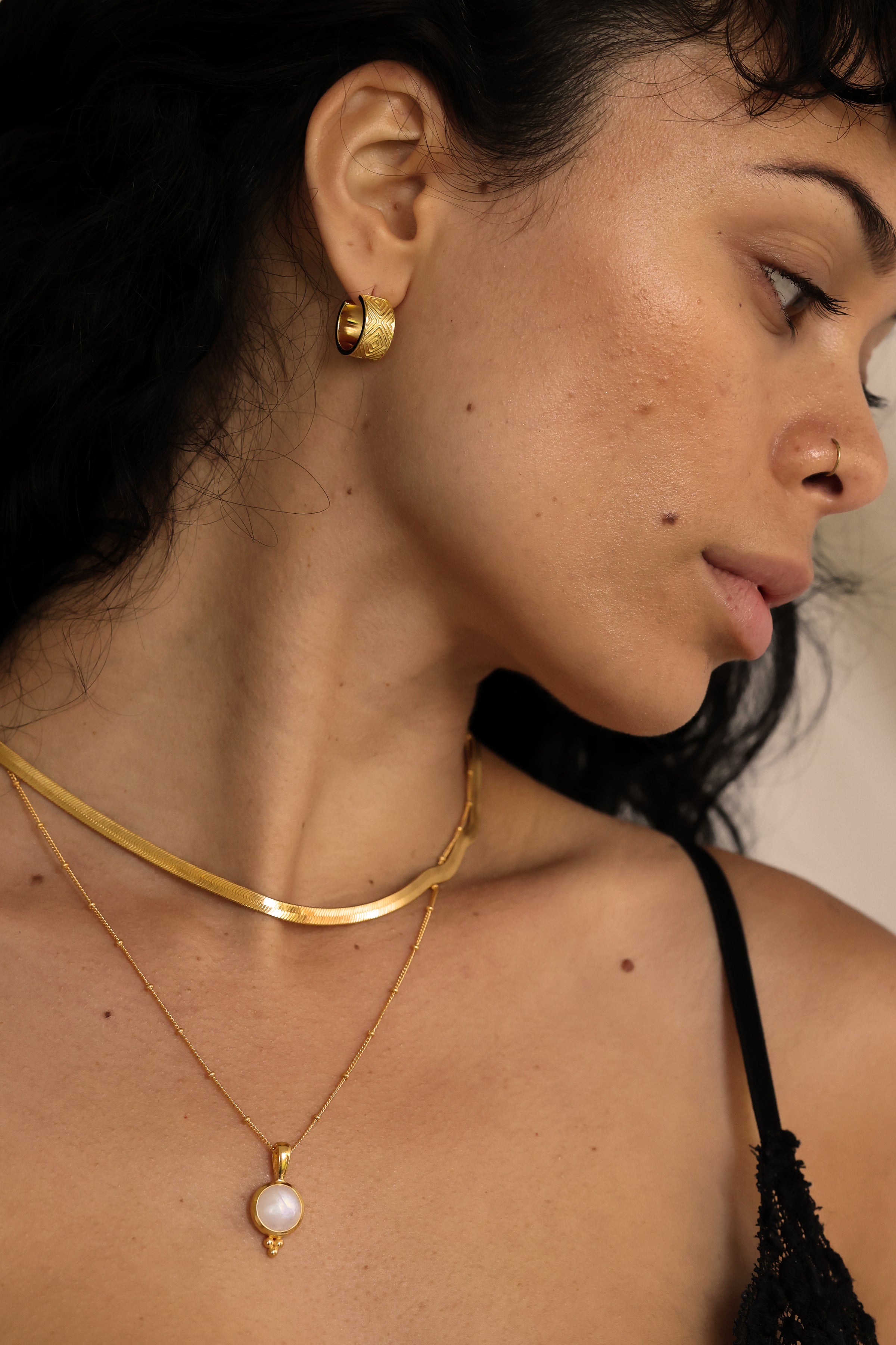This piece is crafted from a sterling silver base and finished with a premium 18-karat gold coating at a thickness of 2.5 microns, enhanced with a protective e-coating. E-coating is a refined finishing technique that increases durability, prolongs the life of the plating, and provides resistance to tarnish. This invisible protective layer adds scratch resistance, helps maintain the brilliance of the gold, and is hypoallergenic — ensuring your piece remains radiant without altering its shine or elegance.